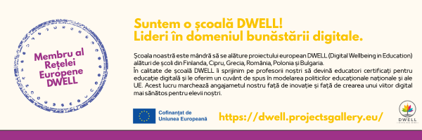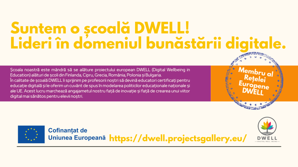 Suntem mândri să anunțăm că școala noastră face acum parte din proiectul european DWELL – Bunăstare digitală: O abordare holistică pentru promovarea stării de bine în cadrul extins al ecosistemului educației digitale (Număr de proiect: 101195998).